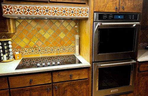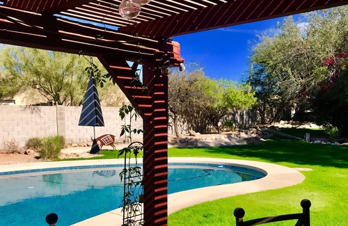 This wonderful 4 bedroom home on 2 1/2 acres is full of surprising and beautiful southwest's art, decoration and design. The 4 bedrooms are decorated with handmade original furniture designed and made by the owner's mother, outstanding paintings, soft luxury bedding, goosedown comforters and amazing mattresses. Comfort is the name of the game and it is available here in abundance. The living area has soft leather furniture, large 70' flat screen TV, huge woodburning fireplace and also includes cable, netflix, wifi and office space. There are split masters at each end of the home with separate entrances. The kitchen has granite counter tops, alder cabinets with stainless appliances and brand new stainless double ovens. The dining area boasts a massive southwestern table with seating for 8. The interior design of the home has been set with meticulous attention to detail and balance. Each room has it's own theme with abundant comfort and luxury, the bedrooms all have ceiling fans, high thread count sheets, beautiful decoration with TV's in each room. Saltillo tile throughout the home the typical southwest floor has been updated with area rugs to enhance the look and feel of this home. The newly designed master bath off west master complements the master bedroom and adds privacy and ample space with saguaro inlaid desk with ample drawer space. New walk in shower in east Master offers light and airy space with top of the line fixtures. A third full bath with Talavera sinks rounds out the home. Plenty of parking is available for trailers, trucks or any other vehicle that you might bring on vacation. Darcy also owns 3 other VRBO properties in Phoenix and Scottsdale, their numbers are: 686871, 1170488 and 357841, she encourages you to look them up and read the visitor comments from those who have rented from her. This Dynamite property boasts a serene backyard with a gorgeous deep 8 ft pool, luxurious grass, palm trees and flowers. It is the perfect place to enjoy the out of doors with the 55” in TV and new outdoor sofa or dine on the covered patio using the large gas Weber grille. Every care has been taken to make this an experience you and your family (and pets) will remember!