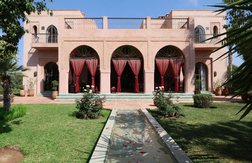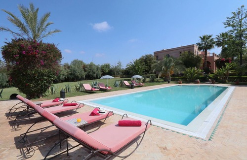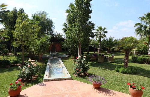Our Marrakech home is a spacious villa which we spent 3 years carefully restoring in a sumptuous yet comfortable Moroccan style, having fallen in love with the setting. The house sits in established gardens of just over 1 hectare, among an olive grove, with orange, lemon and pomegranate trees, flowerbeds full of roses and palms. There is a large swimming pool, and several terraces which provide views of the snow-capped Atlas mountains. The house is in a rural area but only 20 minutes from both the medina and airport. The villa is fully staffed, with a maid, two gardeners, and a cook who can prepare fresh local food daily. She can even go to the shops before you arrive to pick up food for your stay (at cost) to make it a proper holiday...We can also provide an English speaking driver to pick you up at the airport and look after you for the duration of your holiday if you wish. Inside there are 4 bedrooms, a large salon with two seating areas and a big fireplace, a dining room, also with fireplace and a separate TV/games room. All the bedrooms are ensuite and have luxury bedding, and private balconies, and all the bathrooms have showers and baths. Upstairs there is also a separate large roof terrace with sofas and cushions and views over the garden and Atlas mountains. Outside is a large terrace, with a dining table and seating facing a Moroccan tiled fountain, and in the gardens are several separate seating areas organised to capture the best sun! The house & gardens are well set up for children, with a trampoline, table tennis, swings and a gated swimming pool. The nearest golf course is 5 minutes away. The house also comes with a dedicated fibre line for super fast and reliable WiFi internet.