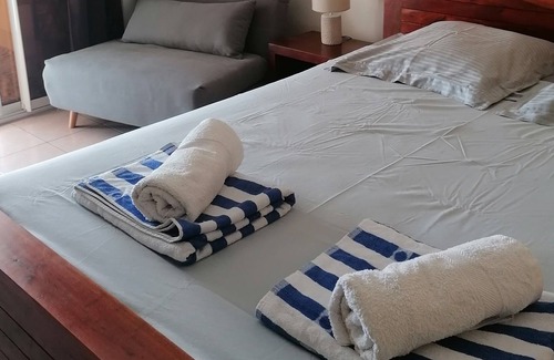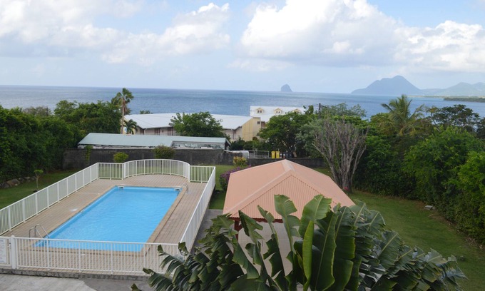 Fully equipped studio, located on the 2nd floor of a small residence, air conditioned, with a 160 cm bed, flat screen TV, Wi fi, large closet, bathroom with shower, basin and WC, modern fitted kitchen on the terrace , with fridge freezer, ceramic hob, washing machine, offering a magnificent view of the Diamond Rock, the swimming pool and the garden, Sheets, household linen provided