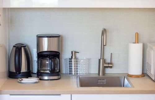 Dishwasher, induction hob, microwave oven, coffee maker, fridge, kettle, kitchen utensils; dishes, cutlery, pots, frying pan, wine glasses
