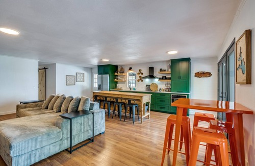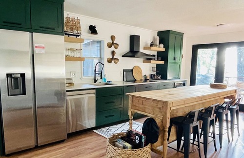 The "chef" is in full view of all guests while in this open-concept kitchen. The house is equipped with everything you need in the kitchen for great cooking. Fully equipped with all cooking utensils and small appliances. Whether you need to make toast, a cup of coffee, or blend up a cool concoction. If you prefer to grill we have you covered with a flat grill (gas) and a full set of BBQ tools available.
