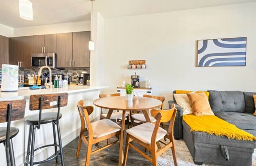 ☕️Warm and inviting, this 1BR suite offers cozy charm with a private balcony, curated espresso bar, spa-like bath, Smart TV, laundry, and a fully stocked kitchen with new appliances. The plush sofa bed adds sleeping space for 2 🛌
