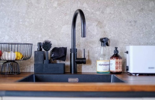 Downstairs you have a fully equipped designer kitchen, large dining table and living space with TV with Netflix and Prime plus sport. Here you will also find the separate toilet and washing machine. There is a small balcony that is drenched with sun in the mornings.