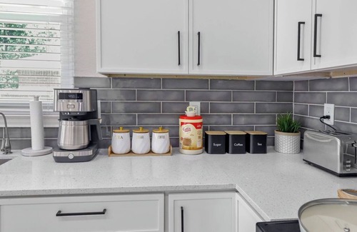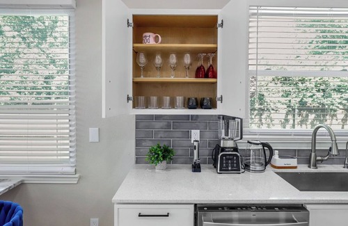 The fully equipped kitchen features stainless steel appliances, a full cookware set, cooking basics (salt, pepper, oil), a coffee maker, toaster, and dishwasher — everything you need to prepare meals and snacks. A dining table seats 4 comfortably, with additional seating at the backyard.