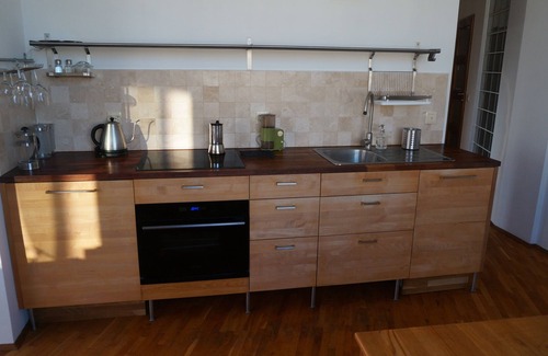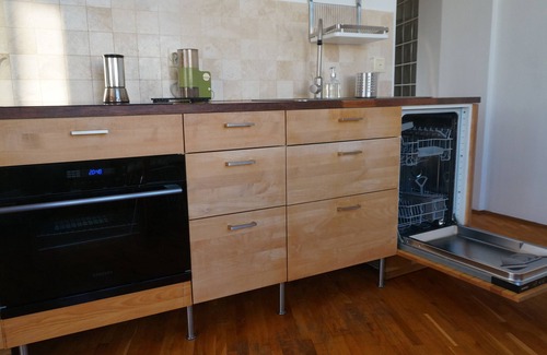 The apartment is equipped with a stable internet connection (Wi-Fi based on DOCSIS technology with a throughput of 300Mbps), a professional computer monitor (HP U28 4K HDR; 4K UHD 3840 x 2160, HDMI 2.0, USB Type-C 65W, DP Alt Mode, USB hub, DisplayPort 1.2) and Android TV Box / DVB-T2 (Amazon Prime Video included). The kitchen is fully equipped and has a washing machine with a dryer, a dishwasher, a microwave oven, and an oven with a steam-cooking function.