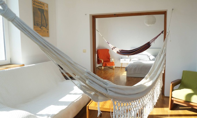 The apartment is intended for a maximum of four adults (two couples) or parents with two children who can sleep together on a sofa bed. The apartment consists of a living room, a bright kitchen, a bathroom, a large bedroom, and a hallway. The living room can be arranged as an additional bedroom as it has internal blinds that separate it from the kitchen. Guests have access to two beds, including one standard large bed and a sofa bed with dimensions of 145x205 cm in the living room. Additionally, two hammocks in the apartment can be hung between the walls in the bedroom or living room.