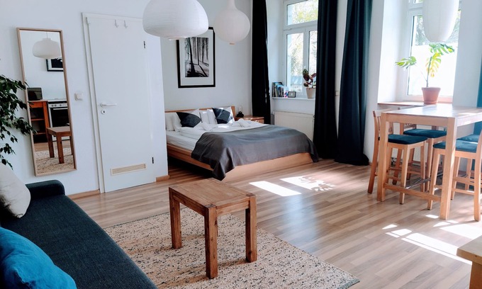 Lovely, newly furnished studio overlooking a sunny garden. The main living area has comfortable queen size bed (160x200), a stylish couch that can be converted into a double bed (184x196), and a wardrobe.