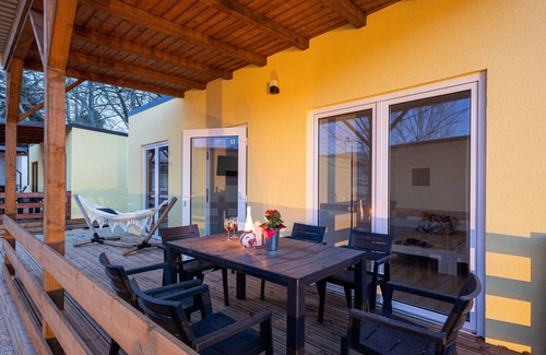 Accommodation units include a fully equipped kitchen and dining room. There is a children's playground between the houses. Car and bicycle rental services and laundry services are available at the reception. Poll is open through season with restaurant.