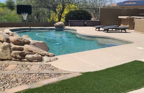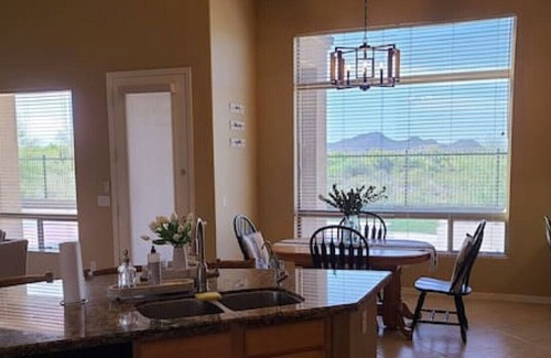 Located in the peaceful and elegant community of Anthem AZ, you will enjoy your time away from home relaxing in a spacious 4-bdrm resort style home complete with a fully stocked kitchen, comfortable living room with a large sectional sofa and TV, and an entertainment room with a wet bar and pool table to test your skills! King and queen size beds available and plenty of privacy and relaxation! Enjoy your day swimming, using the sport court and having a fun BBQ on the outdoor patio!