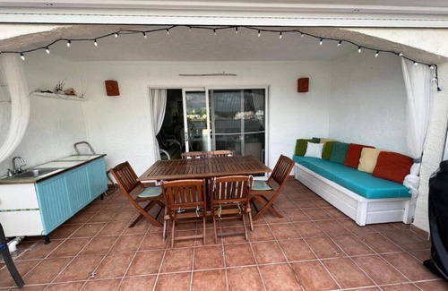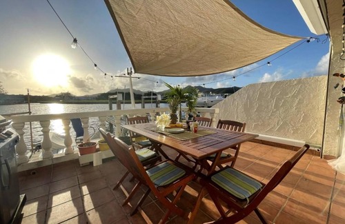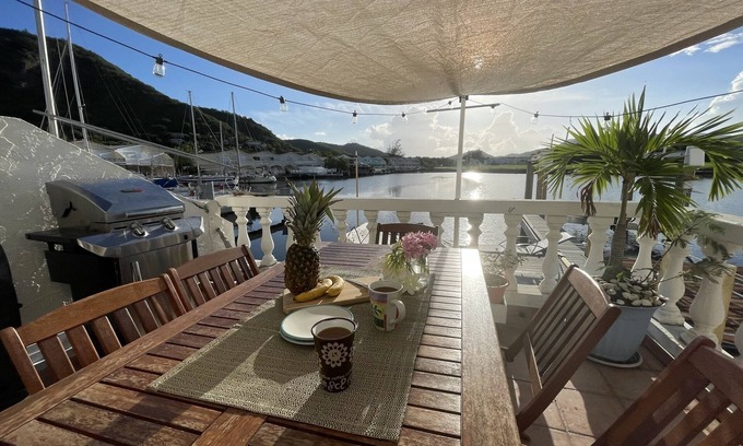 Our Villa is located in the beautiful Jolly Harbor Marina, with views of the lush hills and picturesque waters. It is minutes away from two main beaches. Inside, you will find a well-appointed kitchen next to a breezy, comfy living room. The Villa is equipped with AC and high-speed WiFi throughout. A beautiful terrace with couch and outdoor dining table, make up an extended living space with daily sunsets. Both the master bedroom and second bedroom have an en-suite bathroom. There is a loft bed for the kids in the second bedroom. For a larger group, there is a Murphy bed in the living room. Both bedrooms have black-out curtains and private balconies. Jolly Harbor is the largest marina in the Caribbean, and includes a golf course, swimming pool, tennis courts, grocery store, pharmacy, hair and nail salons, urgent care, golf cart and boat rentals, gas station, a number of restaurants, cafes and bars, and 24/7 security.