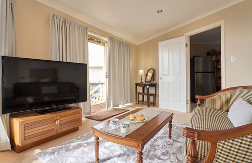 Step into this cosy haven, where up to four guests can comfortably unwind. The main bedroom boasts a queen-size bed, seamlessly flowing into a lounge area with a plush sofa and TV for cosy evenings. In the second bedroom, two king single beds ensure a restful night’s sleep for everyone.