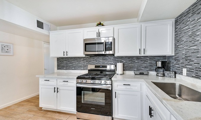 A living room, air conditioning, and a ceiling fan are featured at this 4-bedroom, 2-bathroom rental. Prepare a home-cooked meal in the kitchen, complete with an oven, a stovetop, a microwave, and paper towels. Other amenities include bed sheets, an ironing board, and heating.