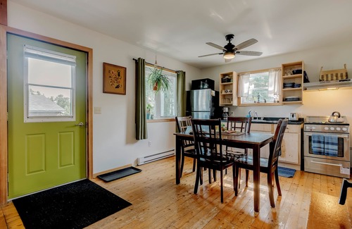 It is bright and open, full of calming house plants, and gets plenty of golden sun through the windows and on the covered deck throughout the day.