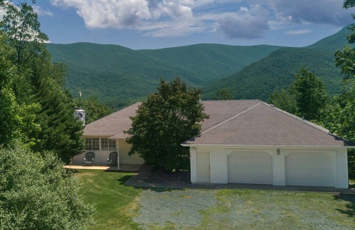 The upper floor has a living room with 50 inch LCD TV, Dish Network and Blu-Ray Disc Player, new spacious kitchen with breakfast nook and table with seating for 6, dining room with seating for 6, game room, sun room with seating for 8, half bath, laundry/mud room, two decks with a hot tub on the larger deck. The master suite is on the upper level and has a king bed, twin-over-twin bunk beds, LCD TV and a huge private bathroom. The lower floor has two bunk rooms each with three full-over-full bunks, two full bathrooms, another bedroom with a queen bed and twin-over-twin bunk beds, kitchenette/laundry room and two covered patios. Each bunk room has a private exterior entrance. The spacious yard has a swing set/play fort, firepit with lots of benches and an amazing view of the Blue Ridge. All pots, pans, utensils, are provided along with coffee maker and toaster. The beauty of nature surrounds you while sitting in the the hot tub, reading a book on the porch, or relaxing by a fire. This is a very clean, lodge style house with rustic touches to make you feel at home. All linens are provided for maximum sleeping capacity.
