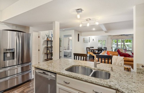 Outside you will find a private dock located in a no wake cove with a 15x34 boat slip. The boat lift in the photos has been removed for the safety of renters boats. Enjoy floating around the dock without the worry of boat traffic. There is a also a kayak and a paddleboard. In the back yard you will find a hammock next to the water.