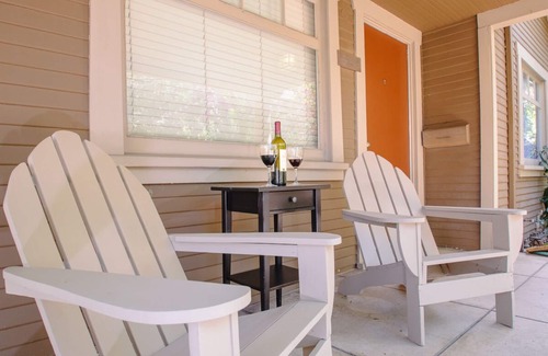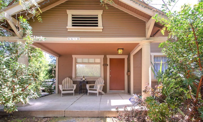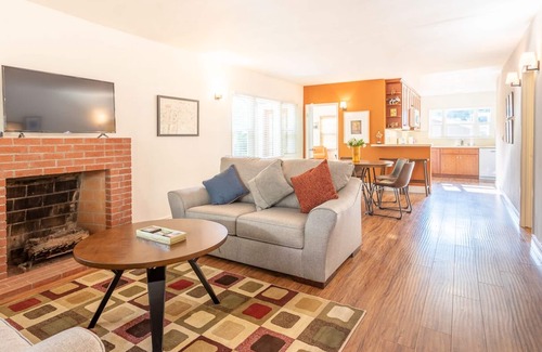 You have 3 bedrooms and 2 bathrooms, large kitchen, open living area with fireplace. The rear patio has a bbq and an enormous tree fill of delicious oranges that are yours to pick. You have off-street parking, washer-dryer, wifi, TV with all the streaming channels, Hulu live TV, complete furnishings, linens, towels, bedding, kitchen utensils, dishes, etc.. Great restaurants within a 3 minute walk... shopping nearby.