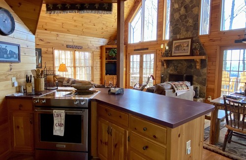 Inside, you'll find a warm and inviting space with a bedroom and bath on the main level, plus an upstairs bedroom, bath, and single sleeper sofa—comfortably sleeping up to five. The open loft provides a peaceful reading nook with scenic views, while the spacious living and dining areas center around a stunning Tennessee mountain rock fireplace.