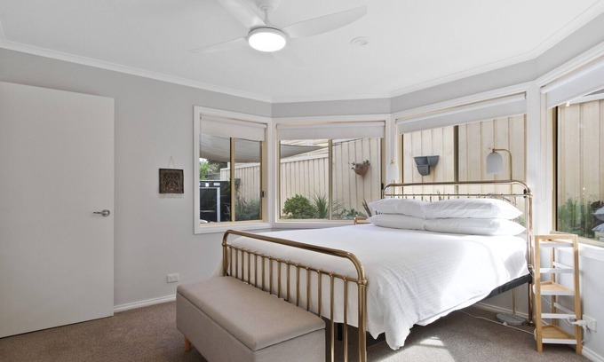 Guests can enjoy a fully equipped kitchen with modern appliances, including a full-size oven, fridge, dishwasher, microwave, and a pod coffee machine. The property also offers an outdoor entertaining area with a BBQ, WiFi internet, a large smart TV with Chromecast, and a collection of DVDs and board games for entertainment. Additional amenities include reverse cycle air conditioning, a washing machine, tumble dryer, and ironing facilities. Parking is available for two cars in the driveway, with additional on-street parking and space for a boat trailer. Please note, the property enforces strict no-smoking, no-pets, and no-party policies.