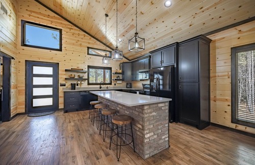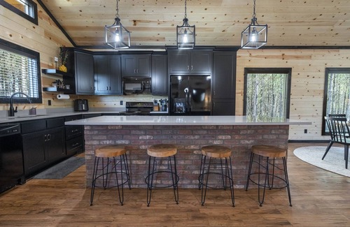 Midnight Memories features an open concept kitchen/living/dining area. With hardwood floors, high ceilings, a gourmet kitchen, bunk bed nook (if needed) and ample windows for you to enjoy the backdrop of the forest throughout the walls of windows, we promise you won't be disappointed! With over 1300 sq ft of living space this 1 bed room, 1.5 bath cabin was designed for couples and small families.