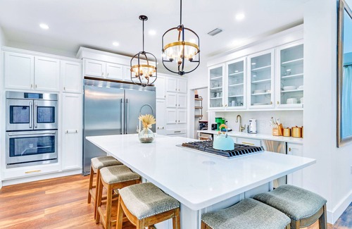 The main living area offers an open floor plan with 18+ ceilings, gas fireplace, & SMART television. The kitchen is fully stocked and boasts high end finishes and luxurious Kitchenaid appliances such as a wine cooler, free standing ice maker, gas stove-top, double ovens, private laundry & whole home water filtration system.