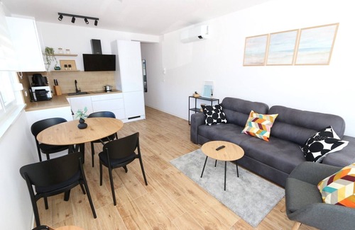 The apartment is situated on the ground floor and covers an area of 56 m2, providing comfortable accommodation for up to 5 people. It consists of two bedrooms, one with a double bed (160x200) and the other with two separate beds (80x200), which can be joined together to form a double bed. Additionally, the apartment includes a spacious living room, kitchen, and bathroom with a shower. Guests will enjoy the comfort of three air-conditioning units, a Smart TV, and free Wi-Fi, while the kitchen is fully equipped with all necessary appliances, including a stove, refrigerator, freezer, microwave, coffee machine, and dishwasher.