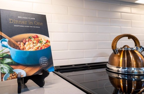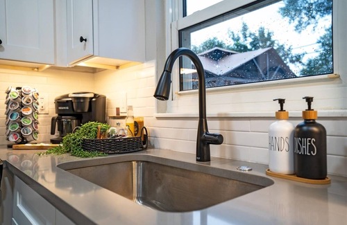 The kitchen is fully stocked with good quality dishes, bowls, cups, glasses, pots & pans, utensils, tapware, bakeware, baking sheets, a Nutribullet and more. Enjoy coffee your way (coffee pot, a Keurig, a French Press & a milk frother).