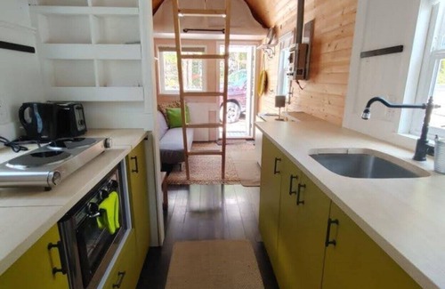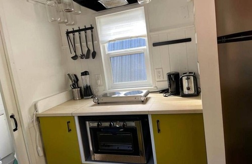 The rental is equipped with essential amenities, including a stove, toaster, water heater, full-size fridge and oven in the kitchen. The bathroom includes a shower, toilet, and sink. You'll find windows and lighting throughout the house, ensuring a well-lit environment. And of course, comfy beds for a restful night's sleep: a double bed on the loft and a pull down futon that fits 1 adult or 2 small children, and 1 tri-fold travel mattress.