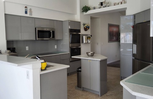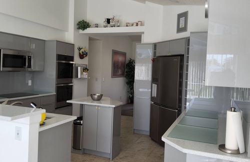 The formal dining room can seat six people comfortably. The main lounge is well equipped with sofas and wall mounted TV, sound system and DVD. It also has a breakfast nook. Cable TV, telephone for local calls and Wi-Fi are all available. The family room has a screened office space with two sofas.