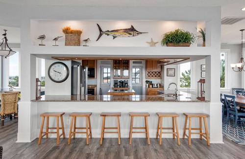 The large kitchen offers granite countertops, ocean and sound water views, two dishwashers, an oven and stove, two crockpots, a waffle maker, a pressure cooker, an air fryer and many other specialty appliances and cooking apparatus. There are also two full-size refrigerators on site – one in the kitchen and one on the ground floor in the wet bar area adjacent to the pool.