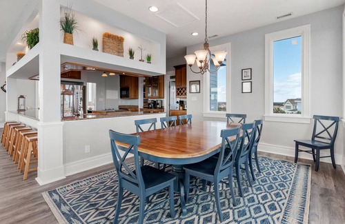 The home comfortably accommodates up to 20 guests and two dogs and is appropriate for multi-family or multi-generational enjoyment. With 360-degree views from 6 upper-level decks and more than 85 windows, this natural light-filled home is designed to showcase the stunning natural environment of the northern outer banks from every angle. Spot eagles, osprey, geese, turtles, deer, and golfers amongst the rolling dunes and seaside vegetation and look out for dolphins and whales playing in the surf - all while you sip your morning coffee! In addition to breathtaking ocean, sound, sunrise, and sunset views, guests can see across Currituck and Dare Counties from the living room with a Birdseye view of Corolla, Sanderling, and Duck.