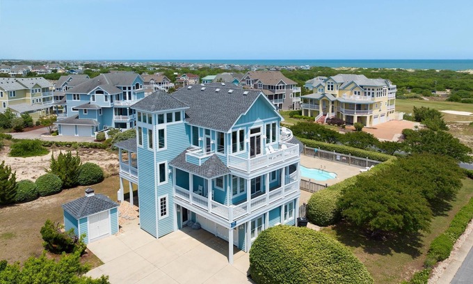 This spectacular 7-bedroom, 4.5-bathroom home sits on the highest point in Corolla and offers “take your breath away” 360° views of the ocean, sound, and Currituck Club Golf Course. The property features a private pool, game room, access to a community gym, an 18-hole Rees Jones golf course, and extensive country club resort amenities.
