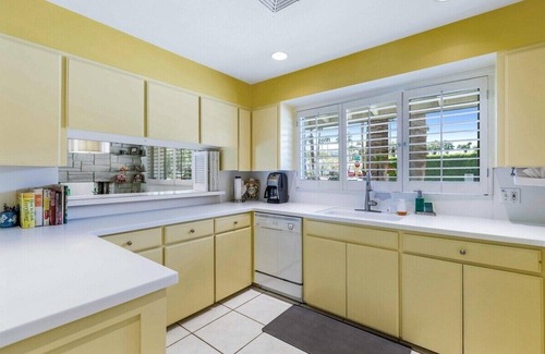 Outside, you'll feel like you're staying in your own private resort in a completely walled, private rear yard with your own private pool, spa, and covered patio, plus lush green grass and beautiful landscaping. Spectacular views of palm trees and mountains are right there creating that restful and relaxing vibe of the ultimate Palm Springs Vacation experience.