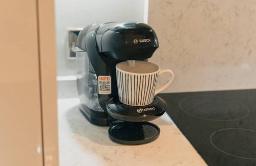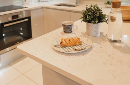 The open-plan kitchen, living, and dining areas are perfect for socialising and unwinding. The fully equipped modern kitchen includes all amenities and features an integrated dishwasher to simplify your stay. You'll also find a coffee machine and integrated microwave for your culinary needs.