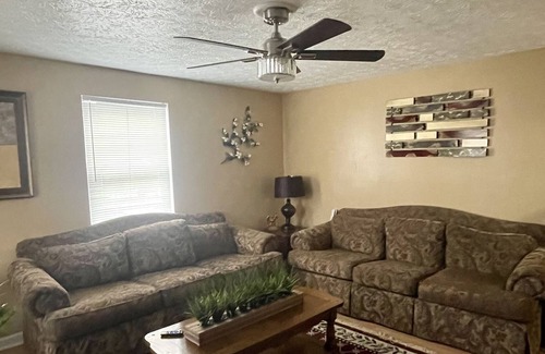 From great cities like Knoxville and Johnson City to the serene wilderness of the Smoky Mountains, you’ll find it all in East Tennessee. This home is just minutes from all kinds of fun and adventure. An older home that has been newly renovated and includes all the comforts of home. Three bedroom, 1 ½ bath within walking distance to Carson Newman, a beautiful walking tail and park, antique shops, restaurants. Two large couches for extra sleeping room. As with any Jefferson City property in this area, you will hear the train at times (I believe it runs at 9am and 4pm), but otherwise very quiet area with beautiful views. Ideal location – approximately 25 minutes from Knoxville, 40 minutes from Pigeon Forge, an hour from Gatlinburg, or Johnson City, and an hour and a half from Bristol or Asheville. Includes, WiFi, fully stocked kitchen, large yard, and more!