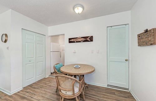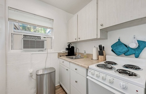 Part of Gecko House on Manasota Key, this ground floor, corner studio is light and bright with a view of the salt water pool. It has a surprising amount of space for a studio, including two dressers, two large nightstands, and a decent sized closet. The kitchen is a pleasant surprise as well with a full sized refrigerator, stove, microwave and a Keurig. Everything you need to prepare and serve meals - except the food - is provided, if you are in the mood to cook. Linens and towels are provided - just bring your beach clothes!