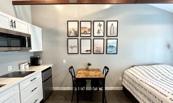 🏝️ Modern and stylish, it’s a rather large self-contained studio with high ceilings, exposed beams, quartz countertops, shelves/hanging storage and California-themed decor.