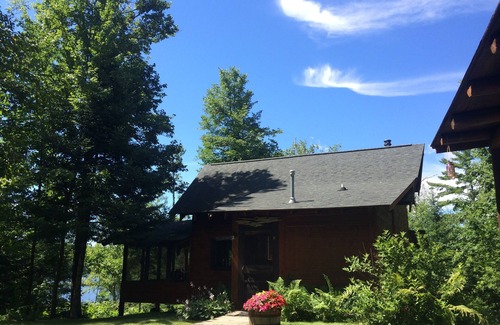 The Adirondack style log cottage sits on a large 60 acre parcel with an abundance of lake frontage in a very private wooded setting. The views from the home are 100% natural...nothing but trees and undeveloped shoreline!!! The large screen porch has great views to the lake making evening dinners seem in the outdoors... the lake side fire pit and chairs create a great place for reflection or marsh mallow roasts...the 3/4 mile private wooded trail is lined with huge pines and is perfect for quiet walks... the kitchen-great room is decorated in a classic northwoods decor with many handmade rustic furniture pieces. (The cabin and much of the rustic furniture was built by the owner.) The second floor loft-bedroom has three beds...two doubles and a queen... it is very spacious and is lined with windows creating beautiful views to the lake. Wood floors, rustic furniture and an abundance of windows add to the Northwoods feel of this unique property. Please note (the walking trail is not open 9-1 to 12-1).