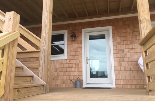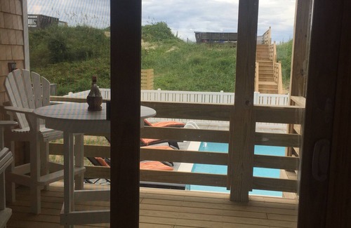 Oceanfront, brand new construction, 2 bedroom, 2 bath and great room, private apartment on first floor of old Nags Head style cottage originally constructed in 1928 above. Beautiful view of pool, glimpses of ocean and steps away from private beach exactly between 2 public beach accesses offering uncrowded beach. Ocean waves lull you to sleep! Modern furnishings with adorable kitchenette with DW, stove, microwave and full size fridge. Wrap around porches with comfortable seating and tables.