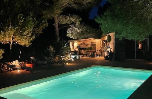 Featuring a large living room facing the pine forest and pool, this house is a haven of peace close to the beach renowned Coussoules. It has three bedrooms and two bathrooms. The kitchen area is equipped with a plancha and a barbecue for meals with friends or family near the pool.