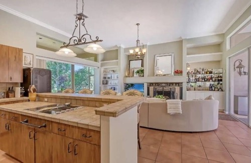 For additional guests, a separate guest house across the courtyard pool provides a private retreat, complete with a queen bed, bath, and kitchenette—ideal for extended stays or welcoming visitors.