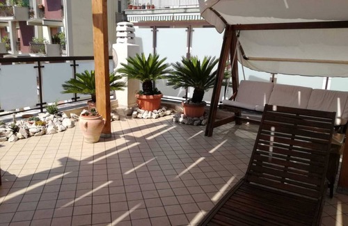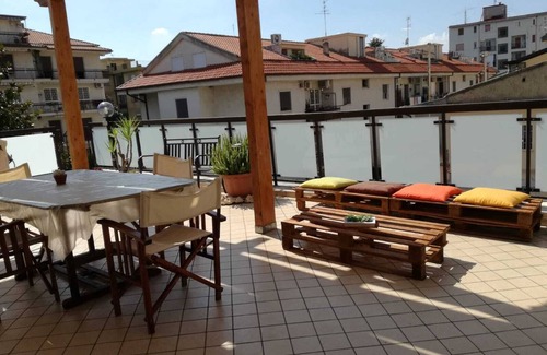 80 sqm furnished attic with equipped terrace located on the second floor of a small property building, at mt. 500 from the station and 600 mt. from the Royal Palace of Caserta, a double bedroom, living room with double sofa bed, Wi-Fi, common room with desk, on-site parking for a fee or under the house if free, supermarket at 200 meters, other shops nearby,