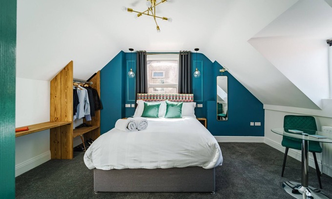 This studio is located on the second floor of our self check in property and boasts: King sized bed, sofa bed, smart TV, kitchenette with kettle, sink, fridge, microwave and welcome refreshments plus an ensuite shower room. We are family friendly, please do request a travel cot if you need one.