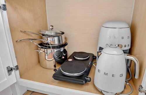 ✔ Small kitchen with mini fridge, microwave, plates, bowls, mugs, knives, cutting boards, and a coffee maker with coffee, sugar + creamers