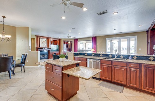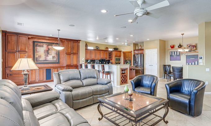 Experience resort-style living with all the comforts of home for your extended stay in Arizona at this 2-bed, 2-bath Surprise vacation rental! This house is perfect for a business trip, a golfing getaway, or an escape from cold weather for the winter months. After a relaxing round of golf or workout at the community fitness center, enjoy the desert warmth out on the patio while the palm trees sway in the breeze. Then, open a bottle of wine and head inside to cook dinner in the chef’s kitchen!