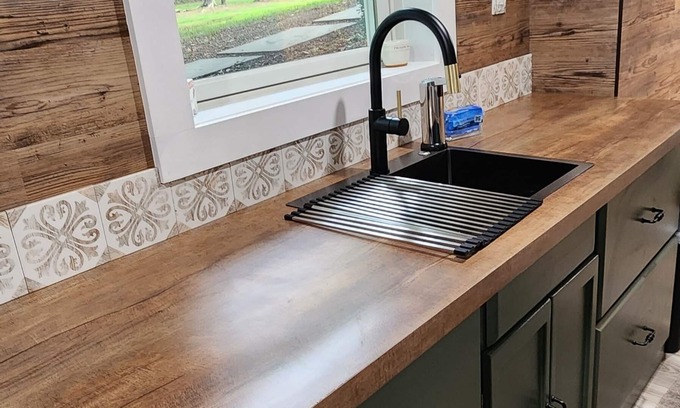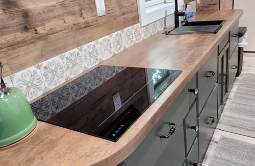 We have a new kitchen that includes all you will need, fridge, airfryer/toaster oven, Kurerig as well as a drip coffee machine, microwave, blender, wine opener, induction stovetop.