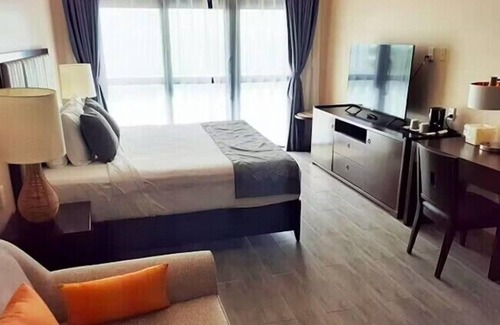 Recreational amenities at the resort include a private beach and an outdoor pool.