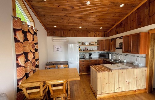 The Chalet offers a fully stocked kitchen, a living room (sofa with pull-out cot) with a large flat screen TV, one full bedroom with a queen bed, a three piece bath, and a garage/recreation area. The house and garage are both equipped with heat pumps for clean heating and air-conditioning. The private back yard hosts a four person table on a brand new stamped concrete patio with an umbrella nestled in the trees, a large BBQ, a fire pit with four chairs, and a large grassed area for washer toss or other outdoor games. The inside garage space has a bar area, a large flat screen TV and a dart board for you to enjoy!