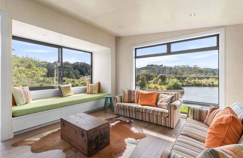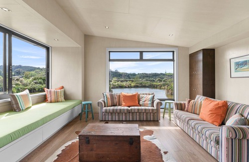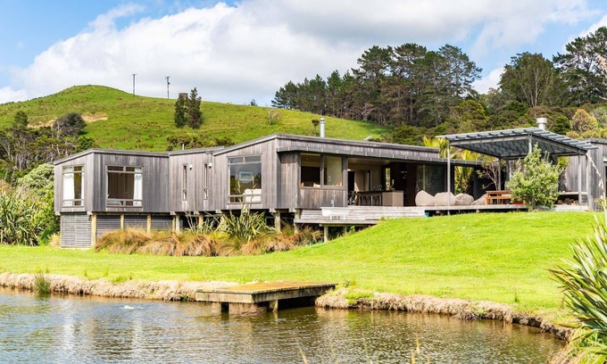 Step into a postcard-perfect paradise at this three-bedroom escape, positioned harmoniously overlooking a private lake in a peaceful spot about 3 km from Tāwharanui Regional Park.