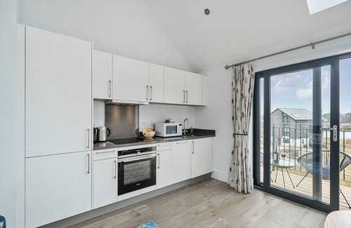 Bijou Swan Cottage is the perfect retreat for a romantic getaway, relaxing break, or an activity holiday for couples or a small family. The property is accessed under the crescent archway to the front door and entrance lobby, and the attractive south-facing accommodation offers a bright open-plan sitting area and kitchen with dining space, plus a king-size bedroom with luxury Tempur mattress and en-suite shower room, all situated on the first floor. The dual aspect windows and vaulted ceilings create an airy and relaxing atmosphere, and a peaceful space. Sliding french doors lead out to the generous balcony, where you can enjoy relaxing and taking in the great views to Beaumont Lake, with the Pine Ridge and Dorset countryside beyond.