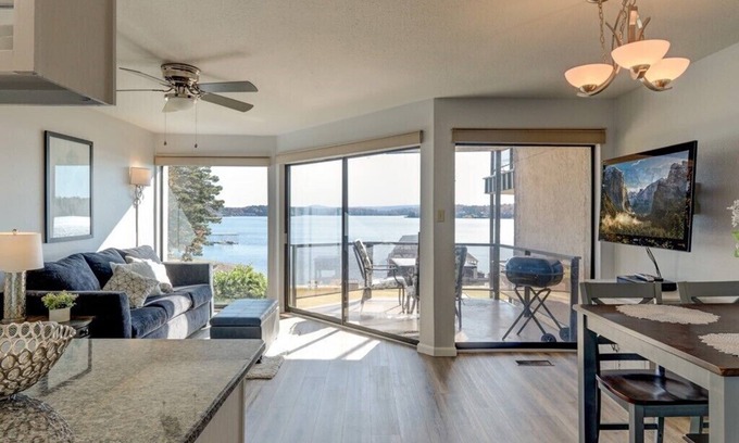 Freshly renovated one bedroom/one bath with deck overlooking swimming pool and shoreline of beautiful Lake Hamilton in Willow Beach Condos. Unit is located on the bottom floor with 8 wide steps down and a sturdy handrail. The updated kitchen has stainless steel appliances and is fully equipped. Unit has private Wi-Fi. Enjoy breathtaking views of the open main channel of Lake Hamilton, one of the best condo views on the lake! Just off Central Ave (Highway 7) are restaurants, shopping, mini-golf, a movie theater and Oaklawn Racetrack and Casino. Enjoy morning coffee and sunrises on your private balcony. See our other property at this same location if needing additional rooms or this unit is not available: Willow Beach B7 (https://www.vrbo.com/2743723?unitId=3315592).